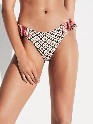Parte de baixo do biquíni em tecido estampado e detalhe de folho contrastante nos laterais.