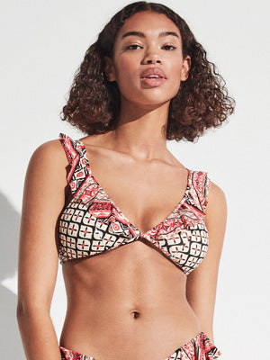 Top de biquíni sem aro e com espuma removível em tecido estampado. Detalhe de folhos contrastantes no decote e nas alças.