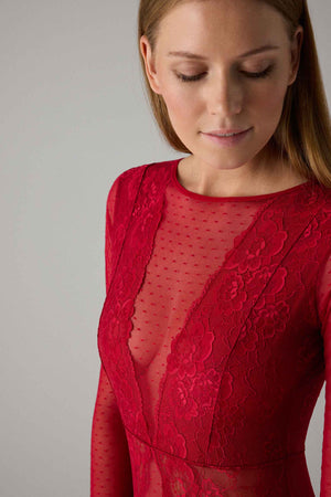 Coleção de Natal. Descubra elegância e sensualidade com este body de manga comprida, sem aro e sem recheio, com colchetes ajustáveis na parte íntima. Este sofisticado body combina um design de renda e transparências plumeti para criar uma peça única e sedutora. As mangas compridas dão um toque de glamour, enquanto o fecho ajustável de gancho e olho na parte inferior garante um ajuste perfeito e confortável. Perfeito para ocasiões especiais ou para usar em privado, este body é a escolha ideal para uma mulher autoconfiante e com um gosto impecável em lingerie.