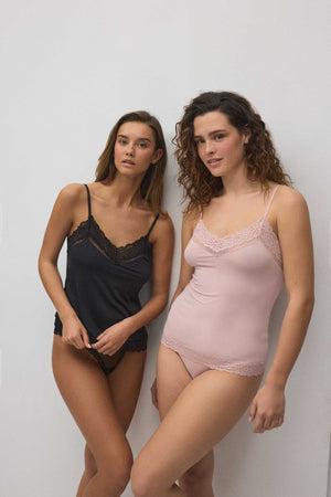 Camisola de alças. Parte superior com detalhe em renda e plumeti. Parte inferior com detalhe em renda. Uma peça feminina e sensual que não pode faltar no seu armário.