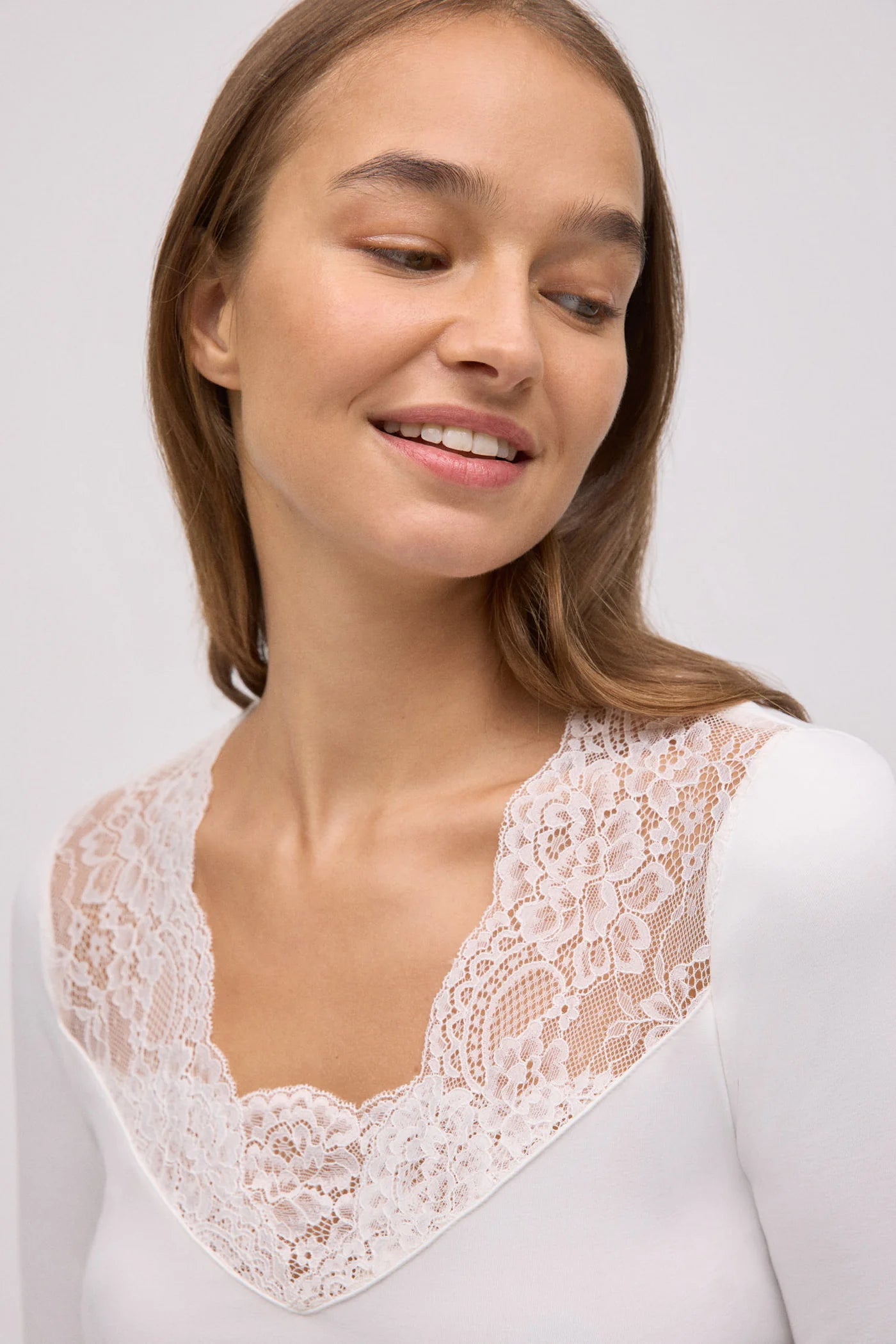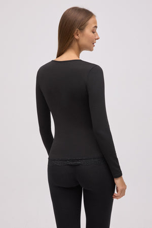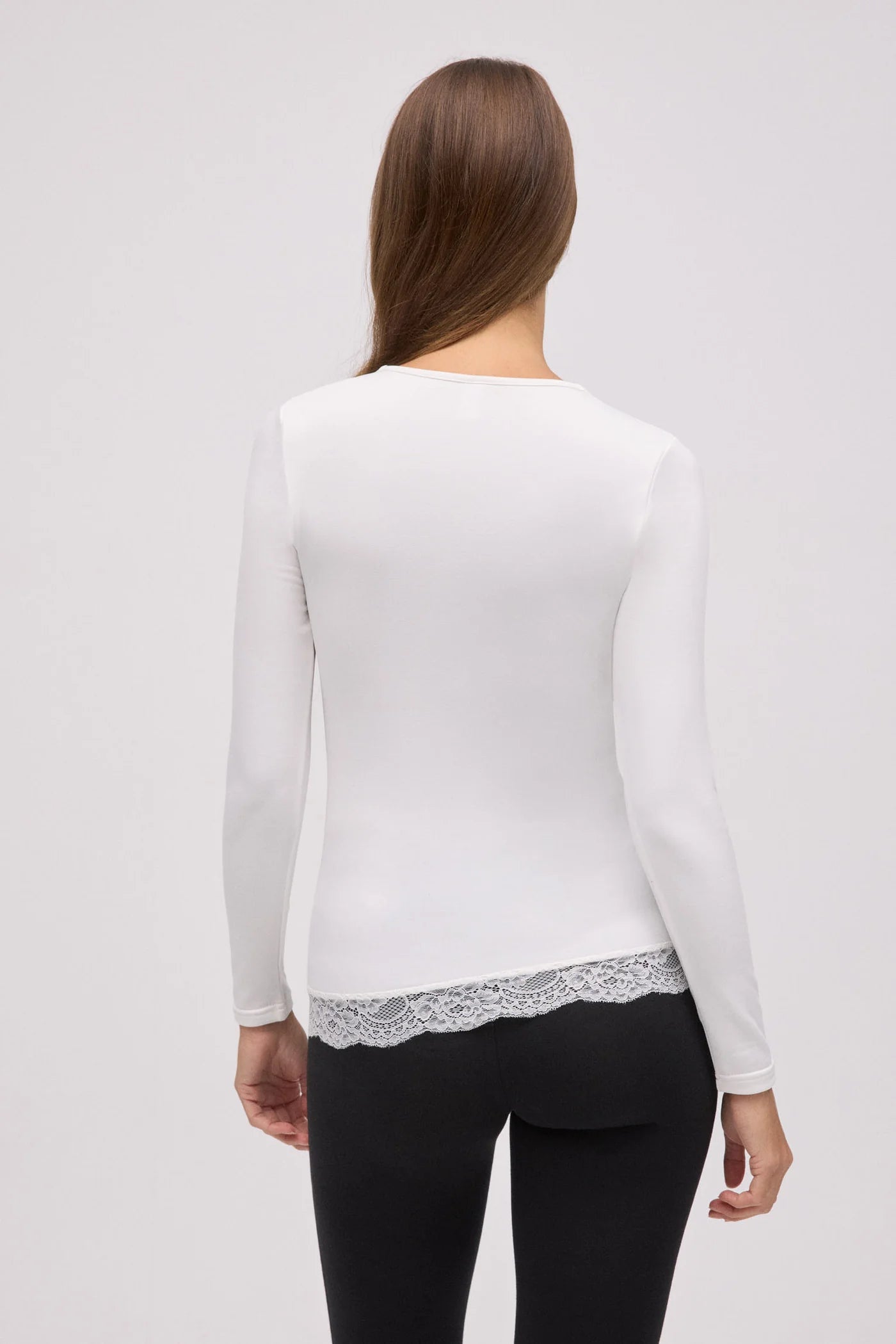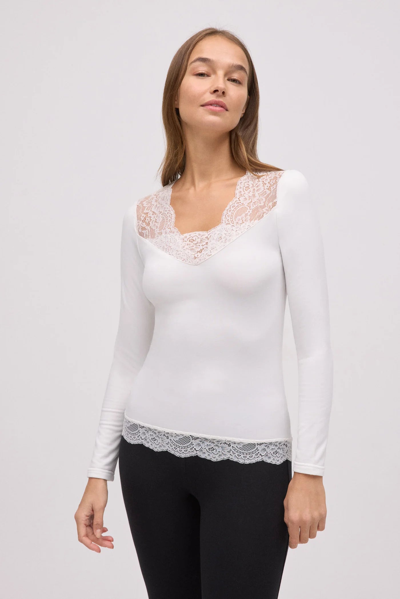 Camisola Térmica de Manga Comprida para Mulher com Gola em Bico e Renda