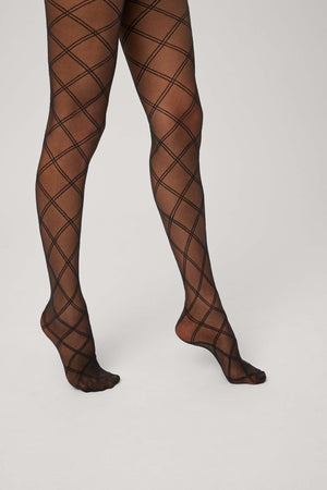 Meia-calça 20 DEN na moda. Padrão de diamante com linhas duplas. Tecido de micro rede.