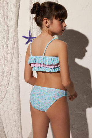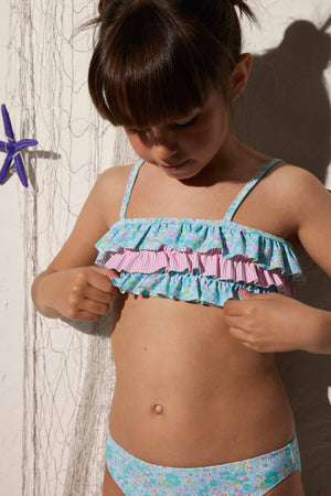 Coleção de natação para crianças. Hora da festa. Conjunto de biquíni para rapariga com top de folhos e cuecas de biquíni. Estampado floral liberty.