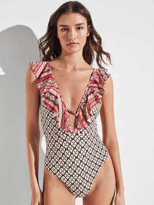 Fato de banho sem aro e com foam em tecido estampado. Detalhe de folhos em contraste no decote e ombros. Use-o também como roupa ao ar livre.
