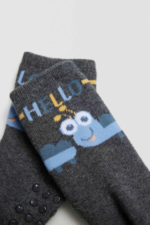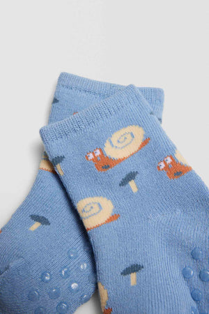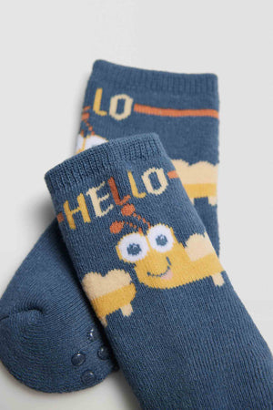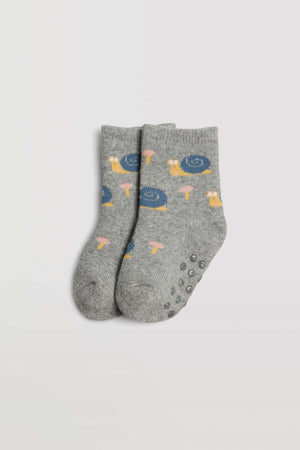 Conjunto de 4 meias térmicas antiderrapantes para bebé. Punho anti-pressão para um apoio extra sem apertar. O seu interior térmico torna-a no acessório perfeito para os dias mais frios, e o seu acabamento em silicone na sola torna-a no complemento ideal para ficar em casa sem preocupações. Estampado "Hello snail".
