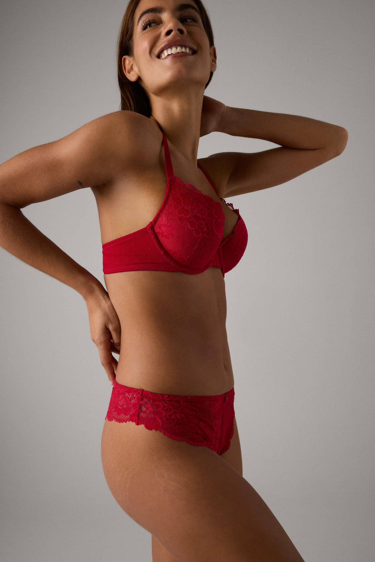 Coleção de Natal. Descubra sensualidade e charme com esta tanga de renda. Confecionada com delicada renda, esta tanga alia elegância e conforto numa peça indispensável na sua coleção de lingerie. O seu design em renda acrescenta um toque de sofisticação e feminilidade, enquanto o seu corte lisonjeiro destaca sedutoramente as suas curvas. Perfeita para usar em qualquer ocasião, seja para uma noite especial ou como parte do look do dia a dia, esta tanga é a escolha ideal para se sentir confiante e bonita por dentro. Combine-o com um soutien da coleção.