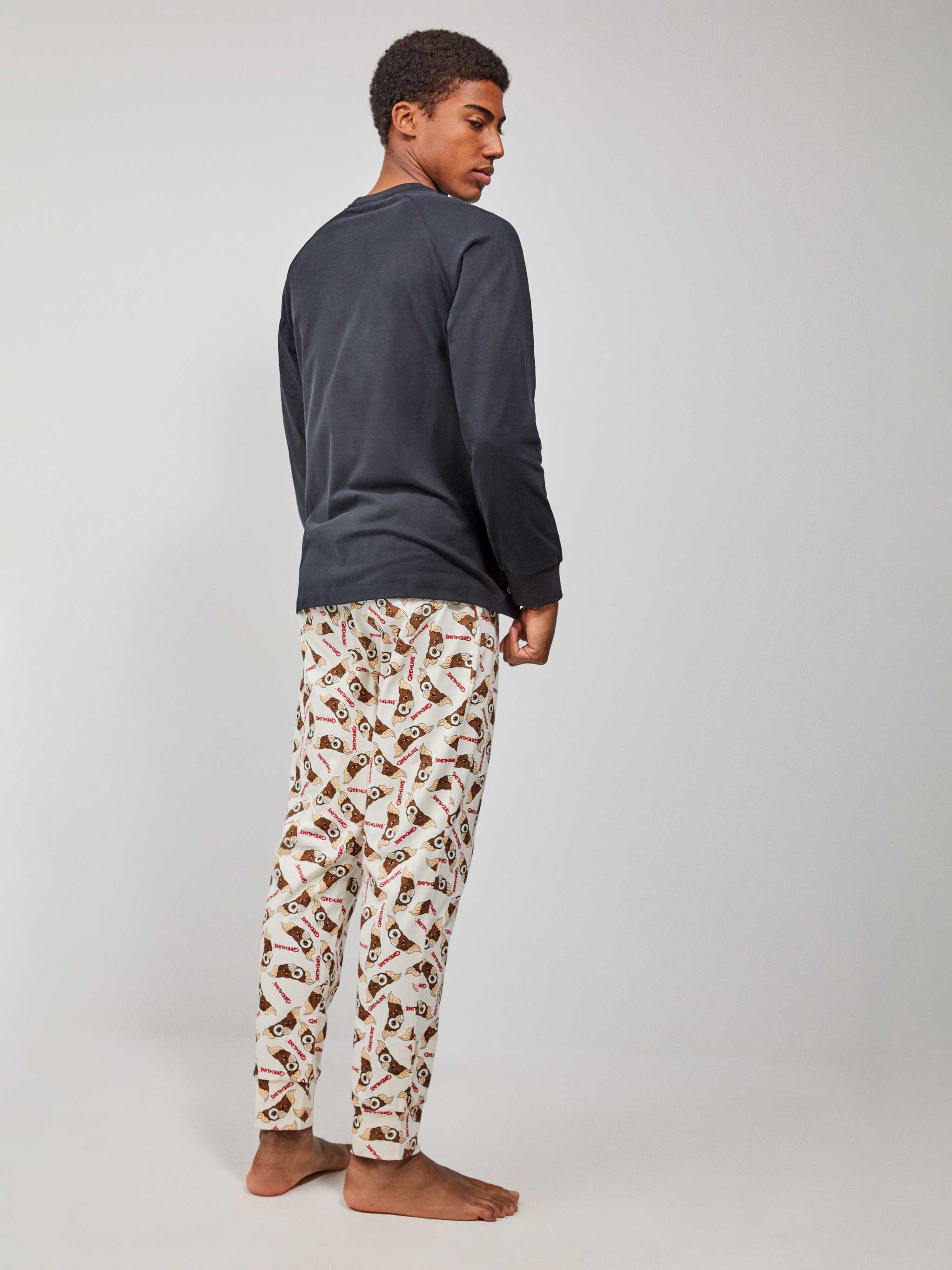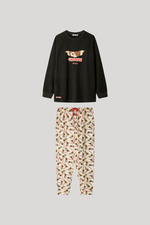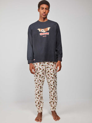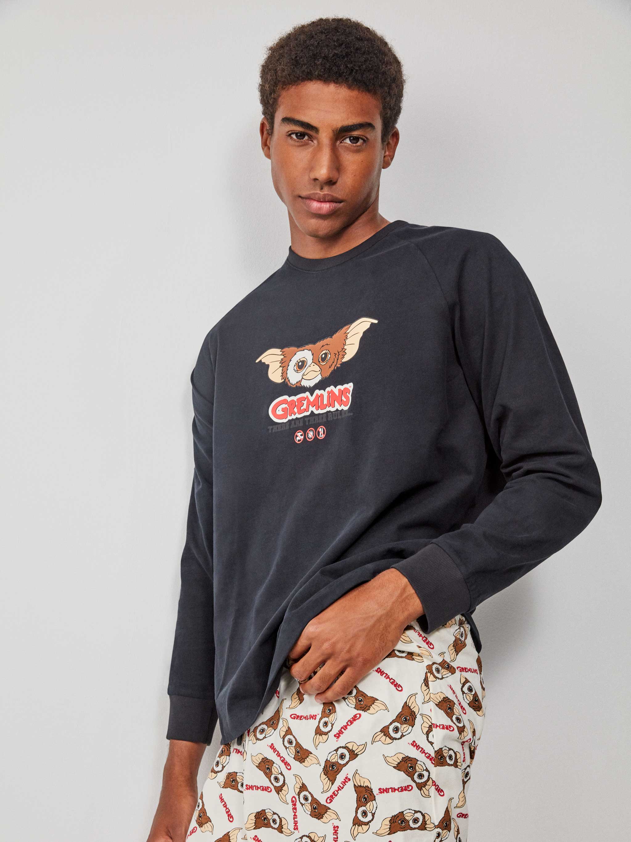 Pijama de homem em algodão com acabamento aveludado e camisola de manga comprida com estampado central dos Gremlins. Calça comprida estampada em contraste com cintura ajustável.