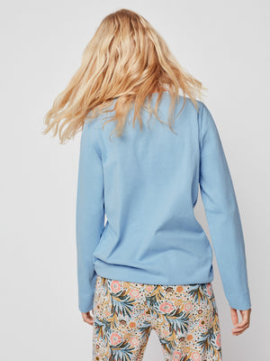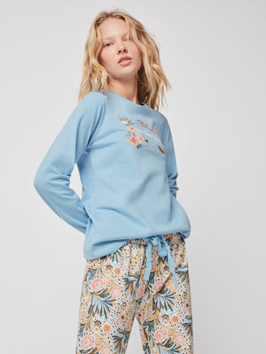 Pijama comprido com camisola de manga comprida e estampado floral no centro. Calça comprida com estampado floral com cintura ajustável com elástico e laço em contraste.