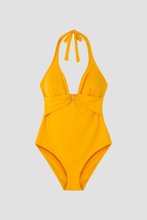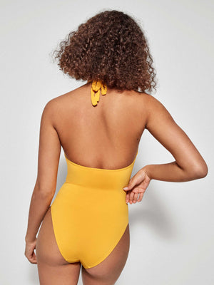 Fato de banho sem aro e com foam. Alças de apertar no pescoço e detalhe no decote.