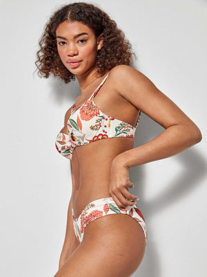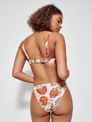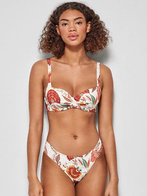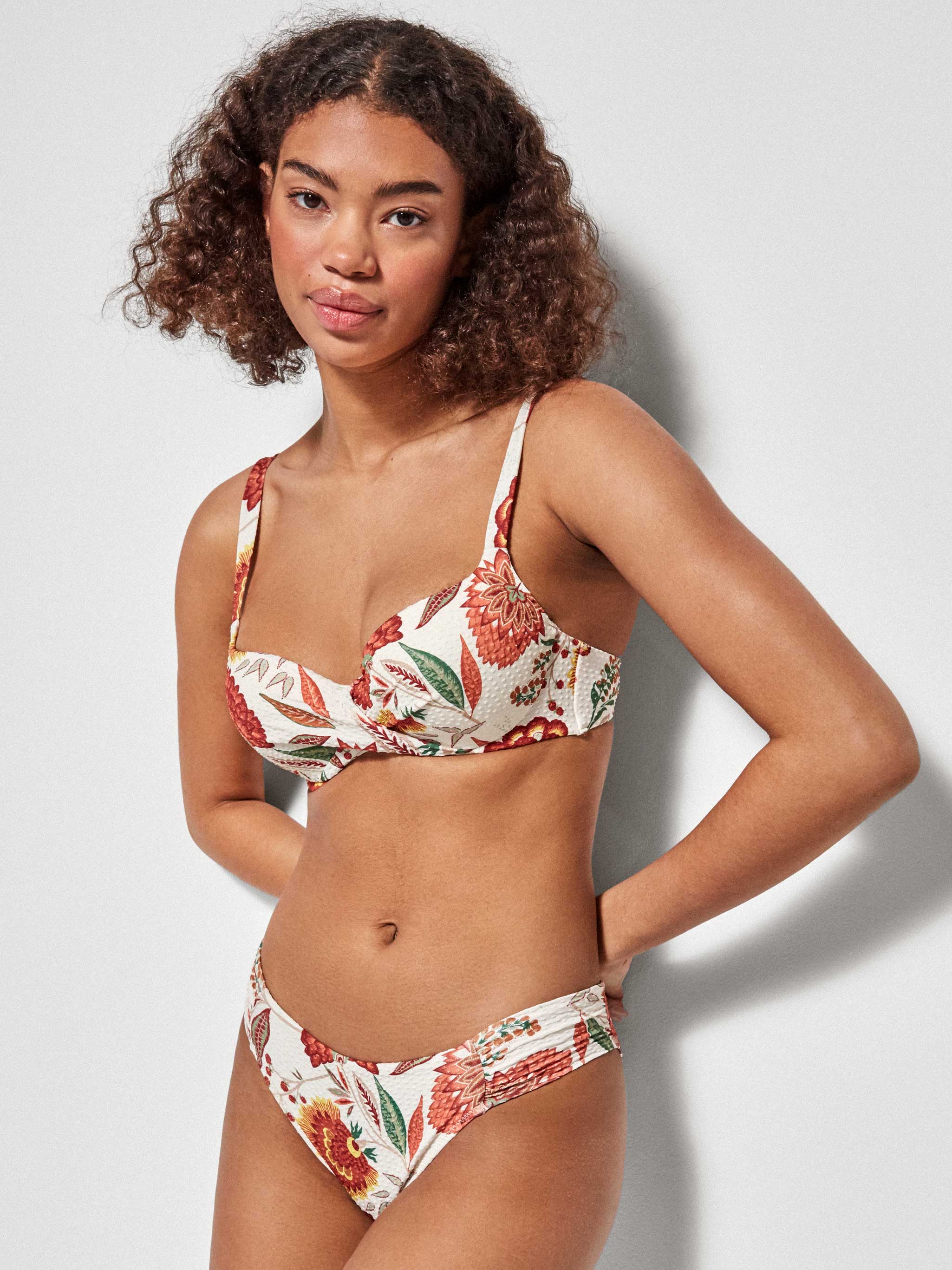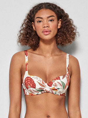 Top de biquini de capacidade com aro e foam em estampado floral. Cruzado no decote que estiliza a zona e costas reguláveis que permite adaptar-se a várias copas desde a B até à D.