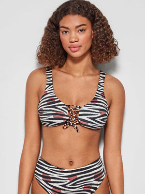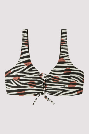 Top Biquini reversível sem aro e com espuma removível em tecido estampado Savannah. Detalhe de cordões do decote para um melhor ajuste.