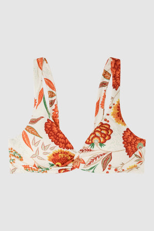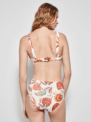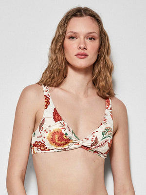 Top de biquíni triangular sem aro e com espuma removível em tecido estampado floral com estrutura de pequenas bolinhas. Detalhe de nó no decote que estiliza a zona e ombro ajustável que permite adaptar-se às copas B e C.