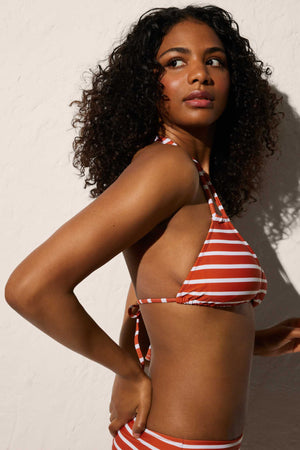Coleção de fatos de banho. Top triangular com acolchoado, estampado de marinheiro nestas cuecas de cor estival. Com nós no pescoço e nas costas para um ajuste perfeito ao corpo, encontre as cuecas a condizer!