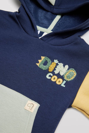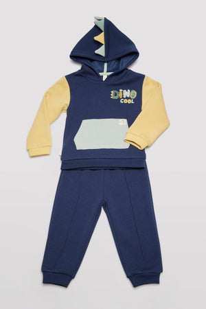 Coleção Dino Legal. Este conjunto inclui moletom com capuz e calça, ambos com interior em lã macia que proporciona calor e conforto nos dias mais frios. O design "DINO COOL" acrescenta um toque de diversão e personalidade, com adoráveis dinossauros que acompanharão o seu bebé nas suas aventuras diárias. O capuz oferece proteção adicional contra o frio, enquanto as calças garantem um ajuste confortável e seguro. Seja brincando em casa ou saindo para passear, este conjunto será a opção perfeita para o seu pequeno explorador.