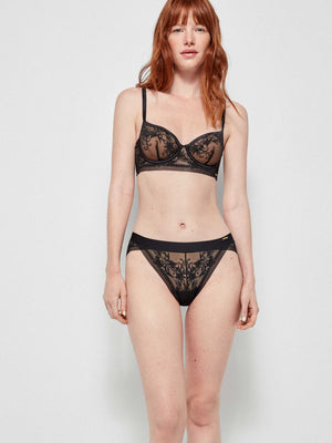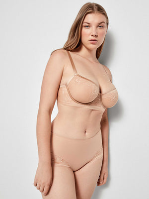 Sutiã de capacidade com aro e foam em renda. Alças reguláveis e fecho traseiro de quatro posições.