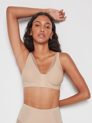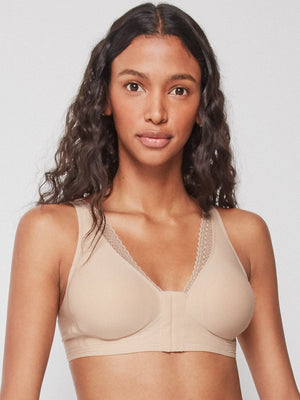 Sutiã pós-operatório com capa para prótese, sem aro e com espuma removível. Pormenor de renda no decote e fecho frontal e traseiro para maior conforto. Acabamentos termofundidos para maior conforto. Tecido de microfibra extra macio e alças largas para maior suporte.