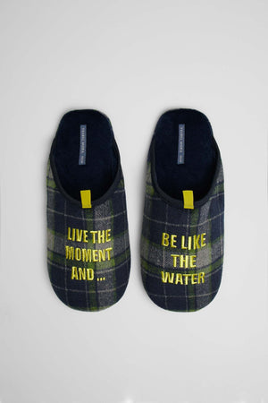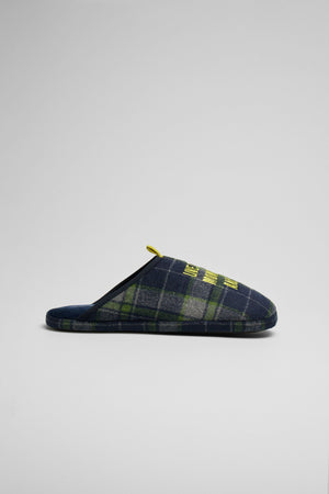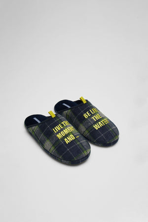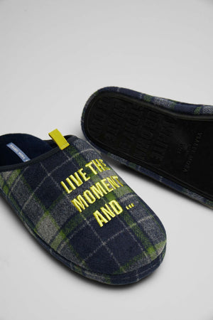 Chinelos de homem com sola de borracha estampada. Estampado em xadrez, combine-os com a manta a condizer!