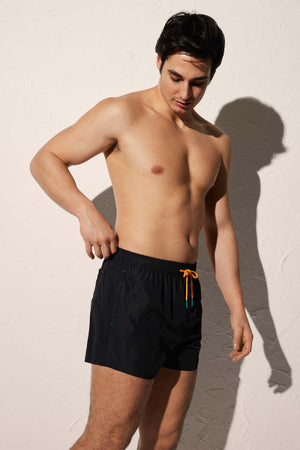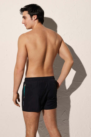 Coleção de fatos de banho. Fato de banho estilo shorty para homem. Tecido ultra-leve e de secagem rápida. Estampado simples.