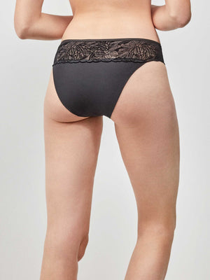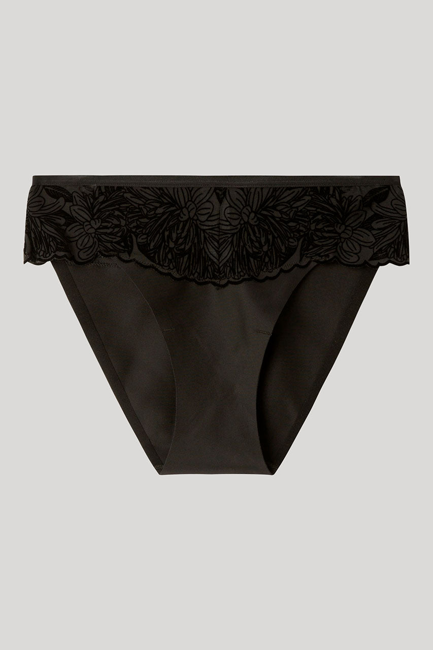 Cueca clássica com corte em V que estiliza a figura com detalhe de tule flocado na cintura.