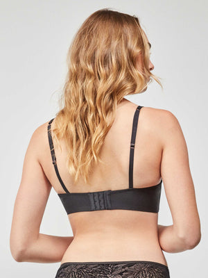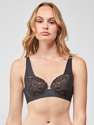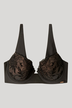 Sutiã com suporte, capacidade com aro e espuma em tecido rendado. Decote profundo para peças especiais. Fecho traseiro de quatro posições.