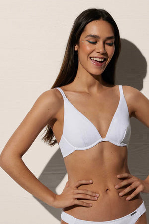 Coleção Uphoria Swim. Top com aros. Fabricado com cores neutras em tecido canelado da coleção mais trendy. Com alças fixas e reguláveis para adaptar a altura à sua silhueta. Fecho com colchete. Combine-o com as partes de baixo da coleção à sua escolha para criar o seu top de biquíni perfeito e ser a rainha deste verão!