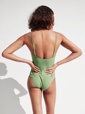 Fato de banho sem aro e com foam removível. Detalhe de decote com forma de V que estiliza a zona.
