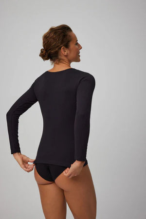A nossa camisola de manga comprida e decote redondo é o equilíbrio perfeito entre estilo, conforto e elegância. Características que lhe permitem sentir-se livre e confortável, sem preocupações, enquanto desfruta de um ajuste perfeito em cada movimento.