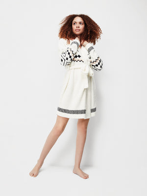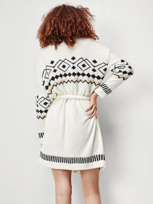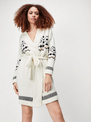 Casaco em tecido tricot com fecho de laço.