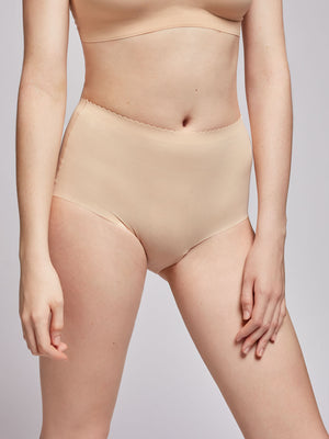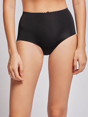 Cueca alta invisível em tecido microfibra com cintura termofundida e cortada a laser para evitar marcas sob a roupa. O tecido de microfibra torna-a macia e flexível e que não se deforma com o tempo.