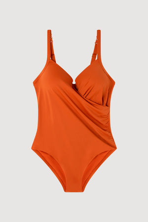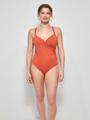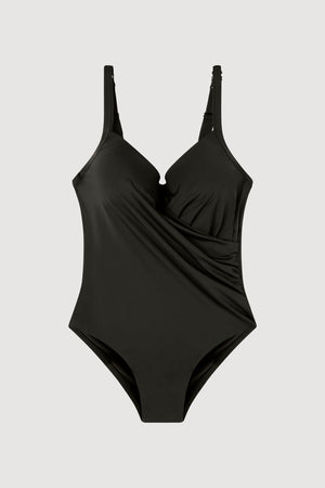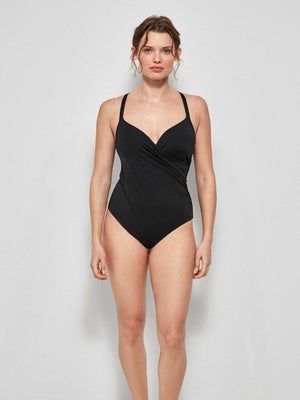 Fato de banho efeito control e plus size com aro e foam. Alças ajustáveis e detalhe cruzado no decote. Disponível em 2 cores.