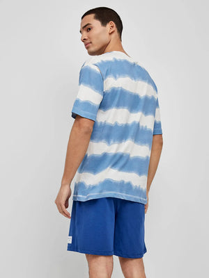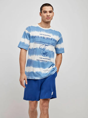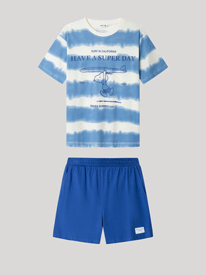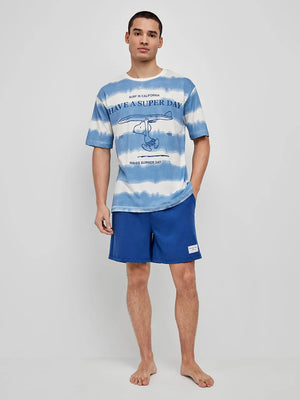 Pijama curto de homem em algodão com t-shirt de manga curta e detalhe de estampado Snoopy no centro. Calções em contraste com bolsos e cintura ajustável com elástico.