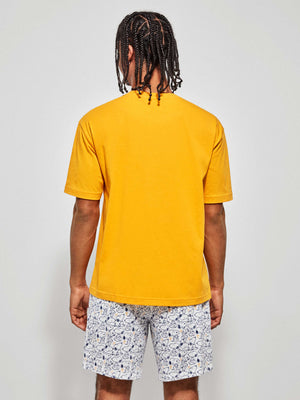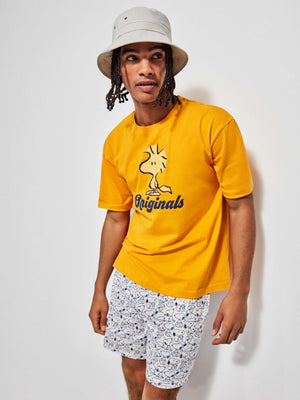 Pijama curto de homem com camisola de manga curta e print do Snoopy no centro. Calçao estampado do snoopy e ajustável na cintura.