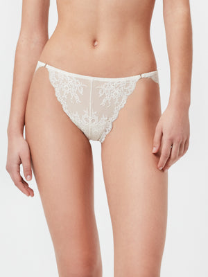 Sutiã Bralette em tecido rendado com aro e espuma. Alças ajustáveis ​​e fecho traseiro em quatro posições. Peça inteira para unir as alças no decote e detalhe de pingente no centro do decote. Cueca brasileira em tecido rendado.