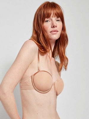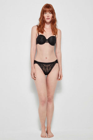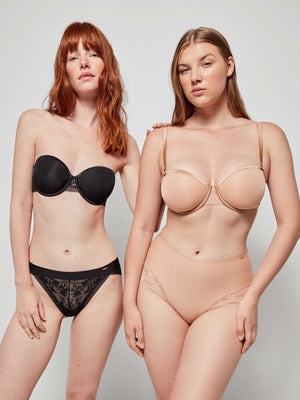 Sutiã desmontável com aro e copas ultra ligeiras. Renda Extraplana, muito delicada e feminina na parte lateral e traseira. Acabados satinados sem costuras que evitam marcas e tecido interior siliconado para uma maior sujeição. Fecho traseiro com quatro posições.