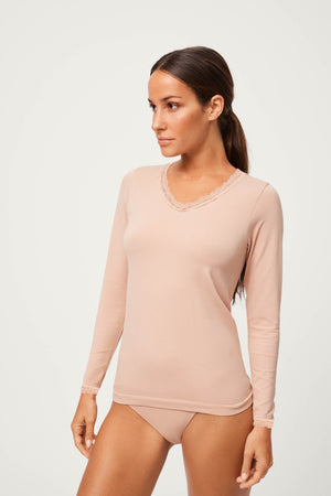 Camisola de manga comprida com decote em V, sem costuras e com detalhe em renda. Tecido fino com grande adaptabilidade e máximo conforto.