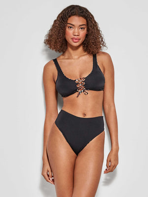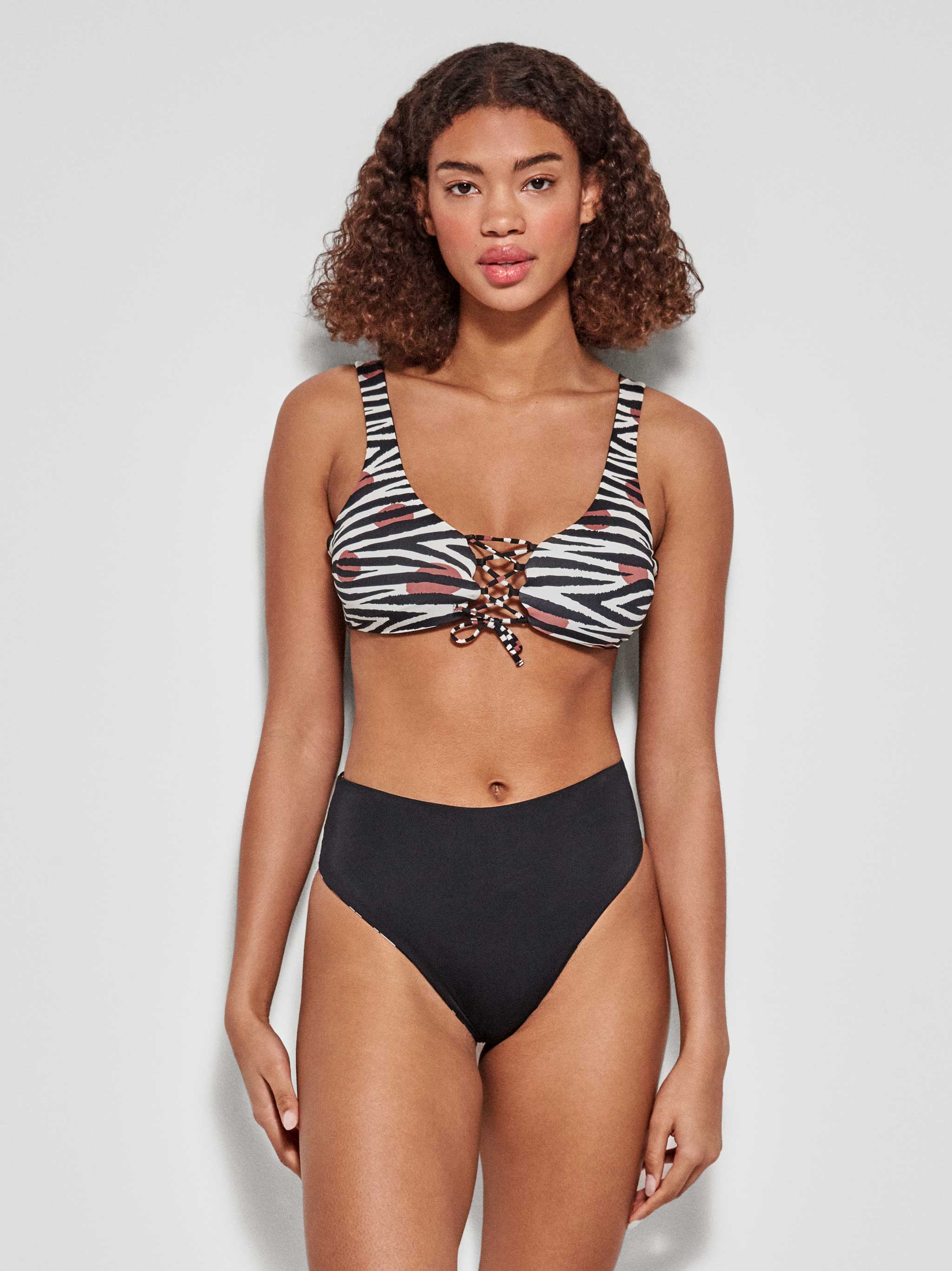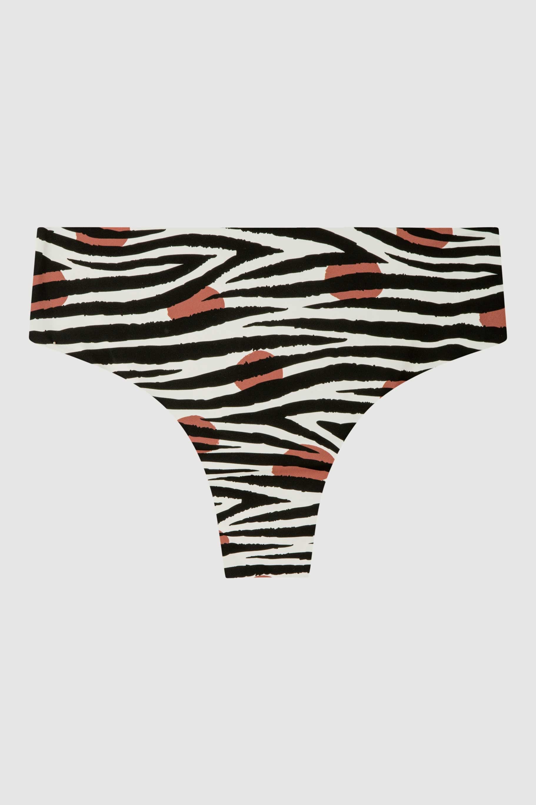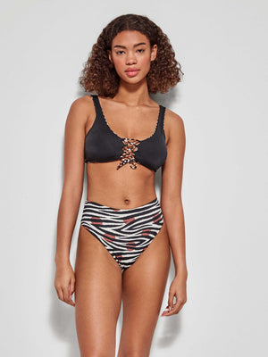 Cueca de biquíni brasileira reversível alta em tecido estampado Savannah. Detalhe de cordões nas costas para melhor ajuste.