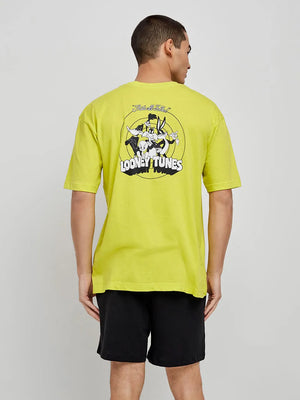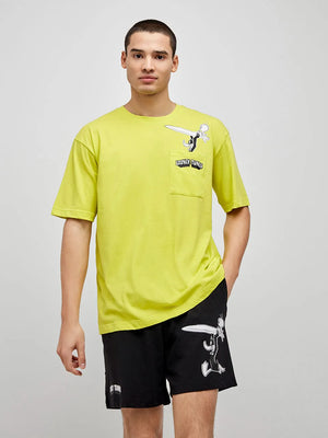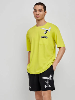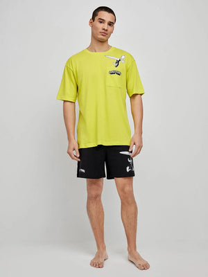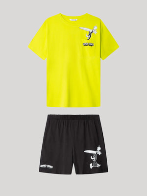Pijama curto de homem em algodão com camisola de manga curta e detalhe de estampado Looney Tunes. Calções contrastantes com estampado Looney Tunes e cintura ajustável com elástico.
