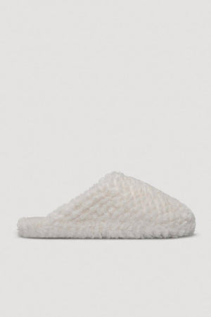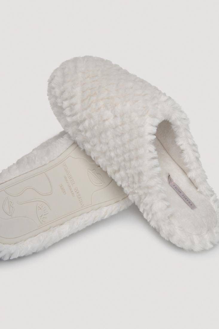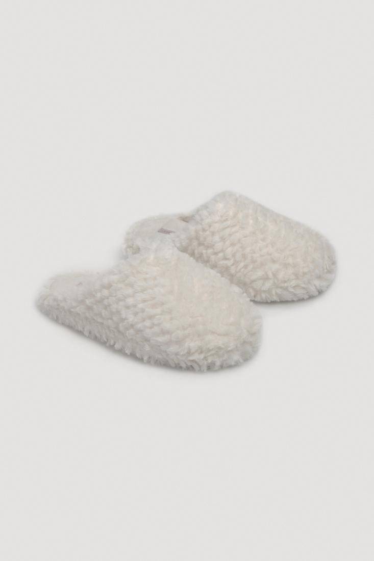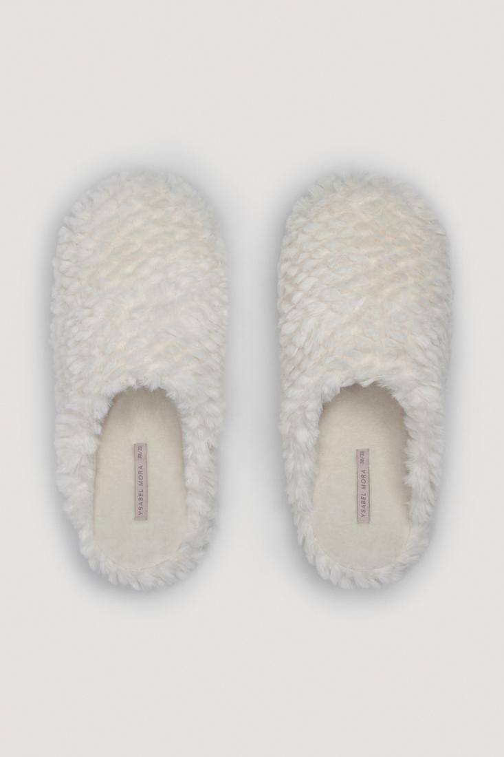 Chinelos femininos com tecido de pele na parte externa. Suave, em tons brancos com interior extra macio. As solas rígidas com aroma de baunilha tornam-nos ainda mais quentes.
