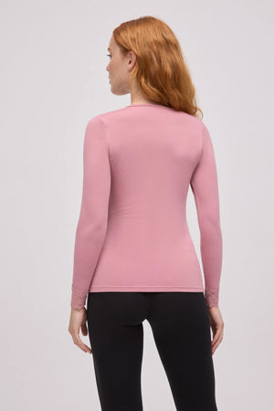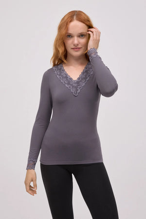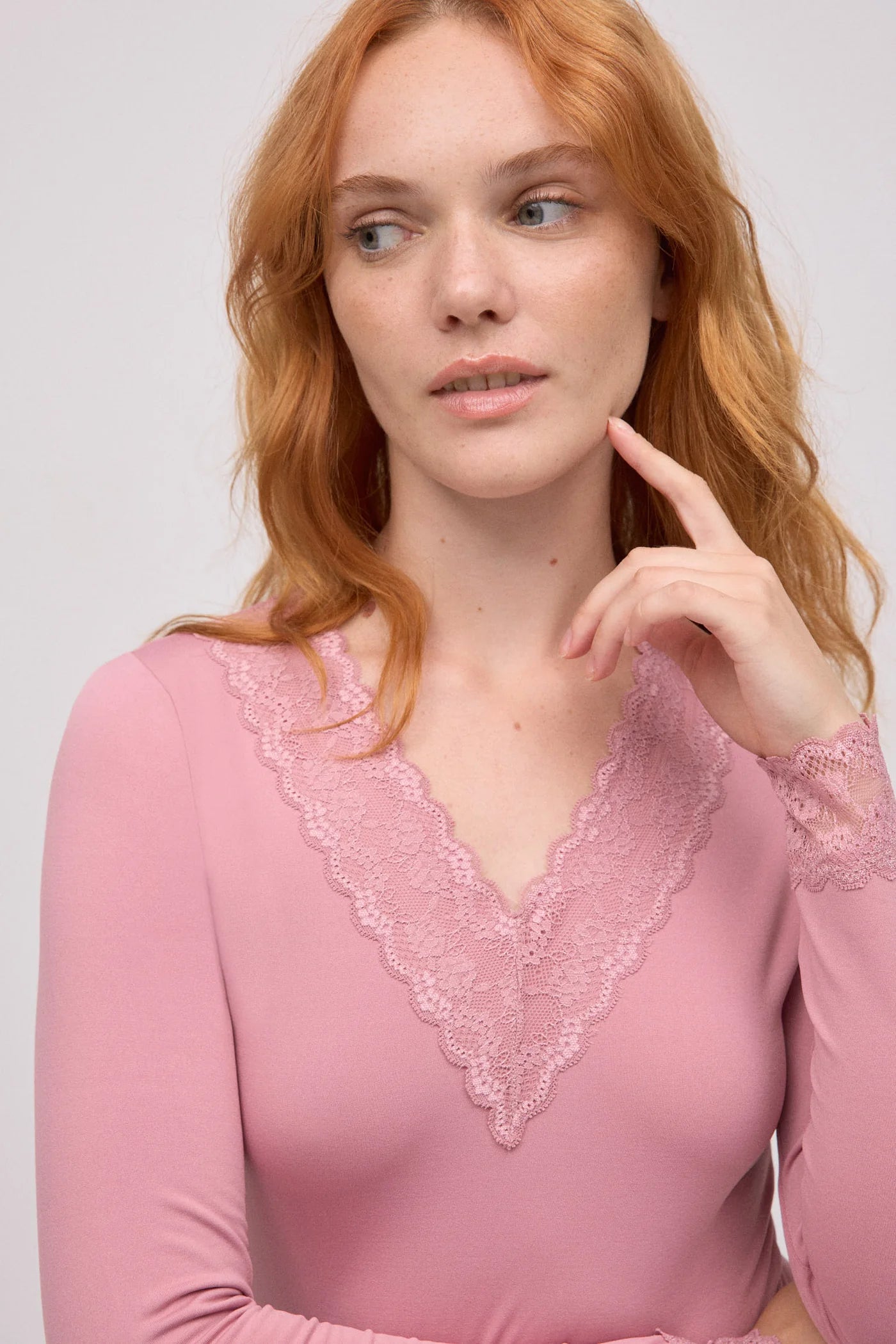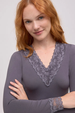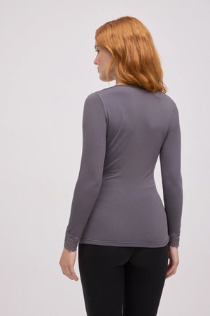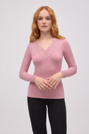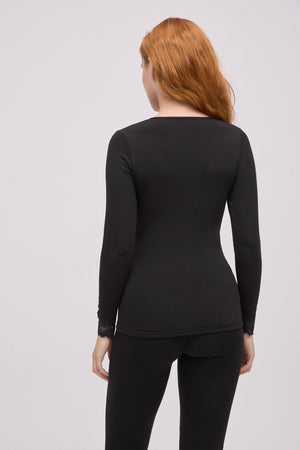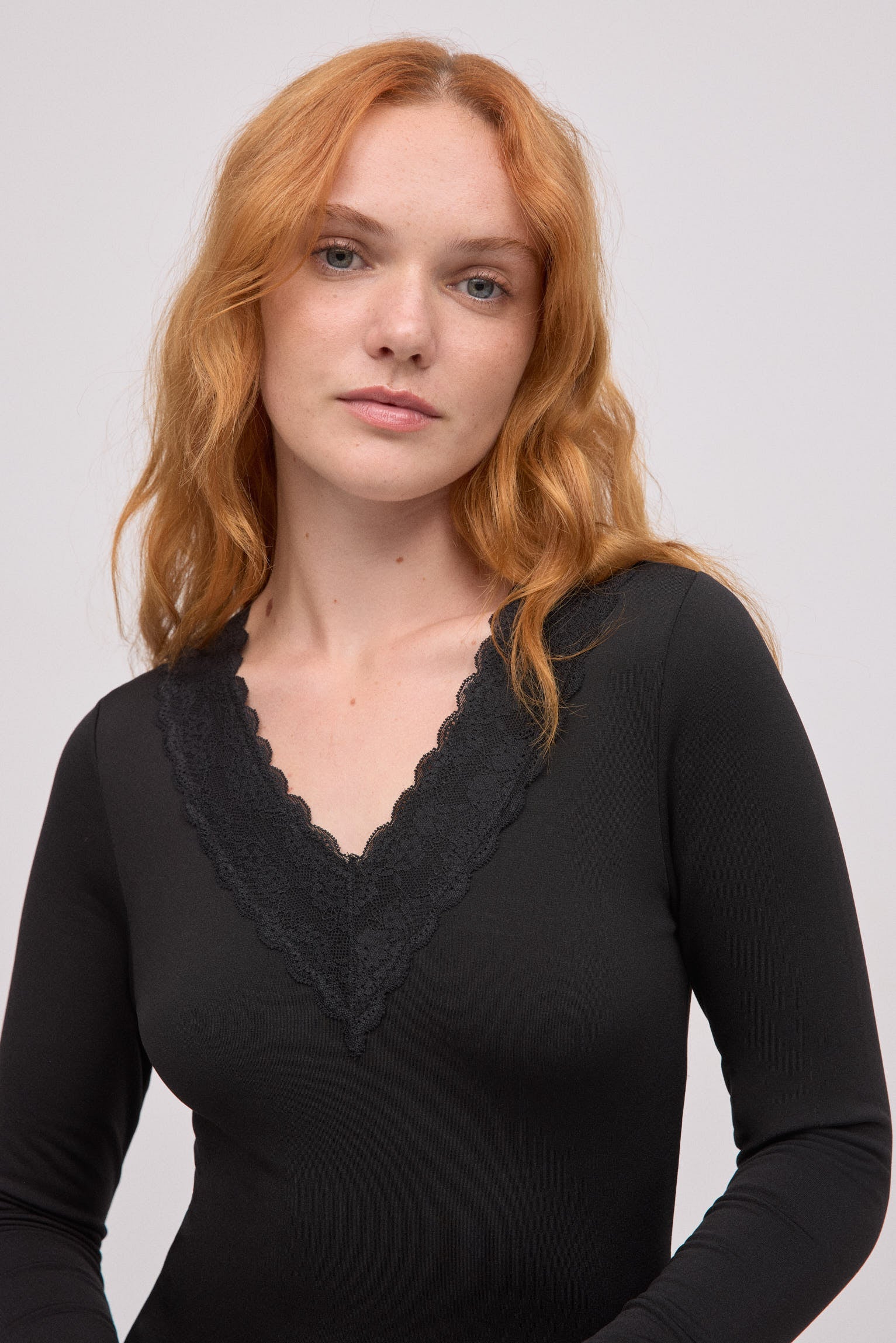 Camisola Térmica de Manga Comprida para Mulher com Gola em Bico e Renda