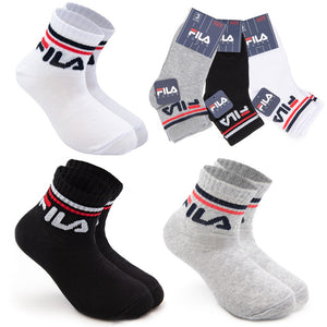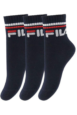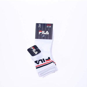 Conjunto de 3 soquetes para menino e menina Fila Quarter F8338, em algodão stretch liso. Cor lisa com escrita Fila bordada na lateral. Punho canelado elástico macio com riscas horizontais coloridas (conforme foto).