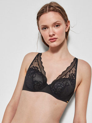 Sutiã bralette com aro e foam em renda. Alças ajustáveis e fecho traseiro de quatro posições.