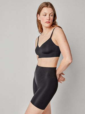 Culotte redutor com reforço frontal e entrepernas "controlo e corte extra". Possui ainda uma peça extra que estiliza as pernas.