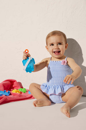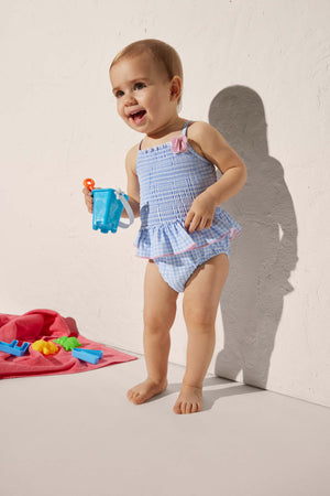 Coleção de natação para crianças. À beira-mar. Conjunto de biquíni para menina com parte de cima e de baixo com estampado vichy azul.