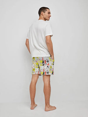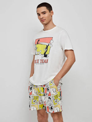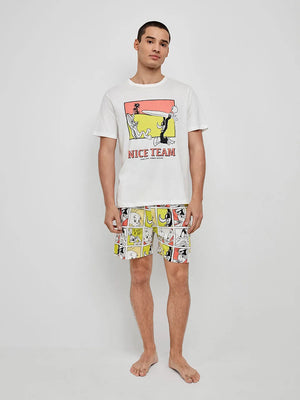 Pijama curto de homem em algodão com camisola de manga curta e detalhe de estampado Looney Tunes no centro. Calções em tecido estampado Looney Tune, bolsos e cintura ajustável com elástico.