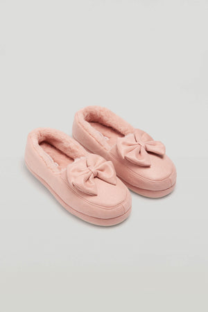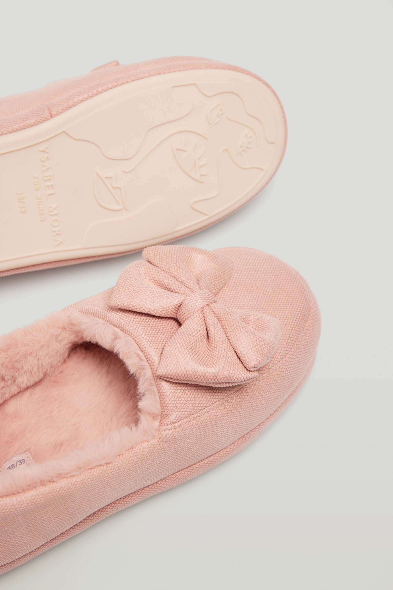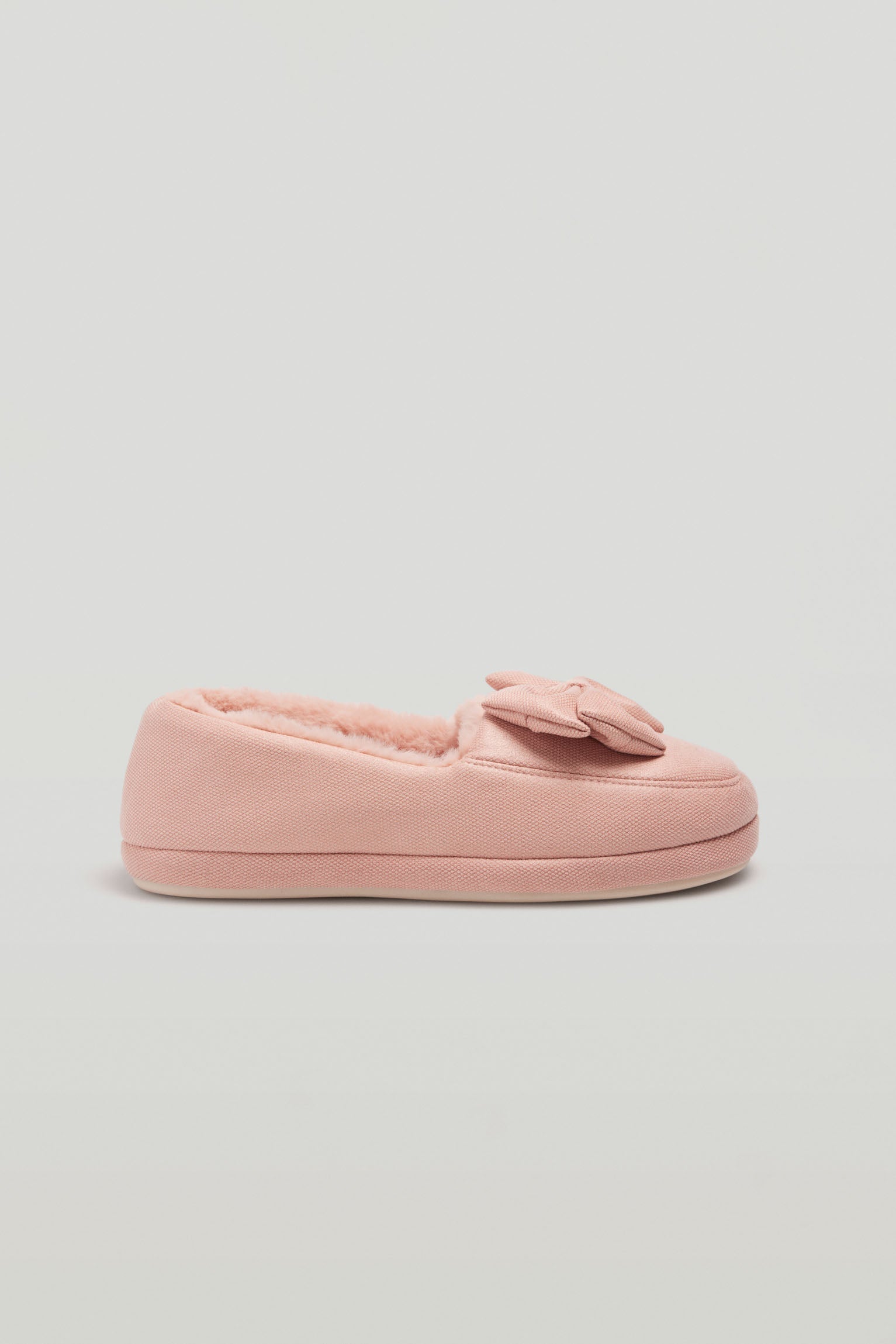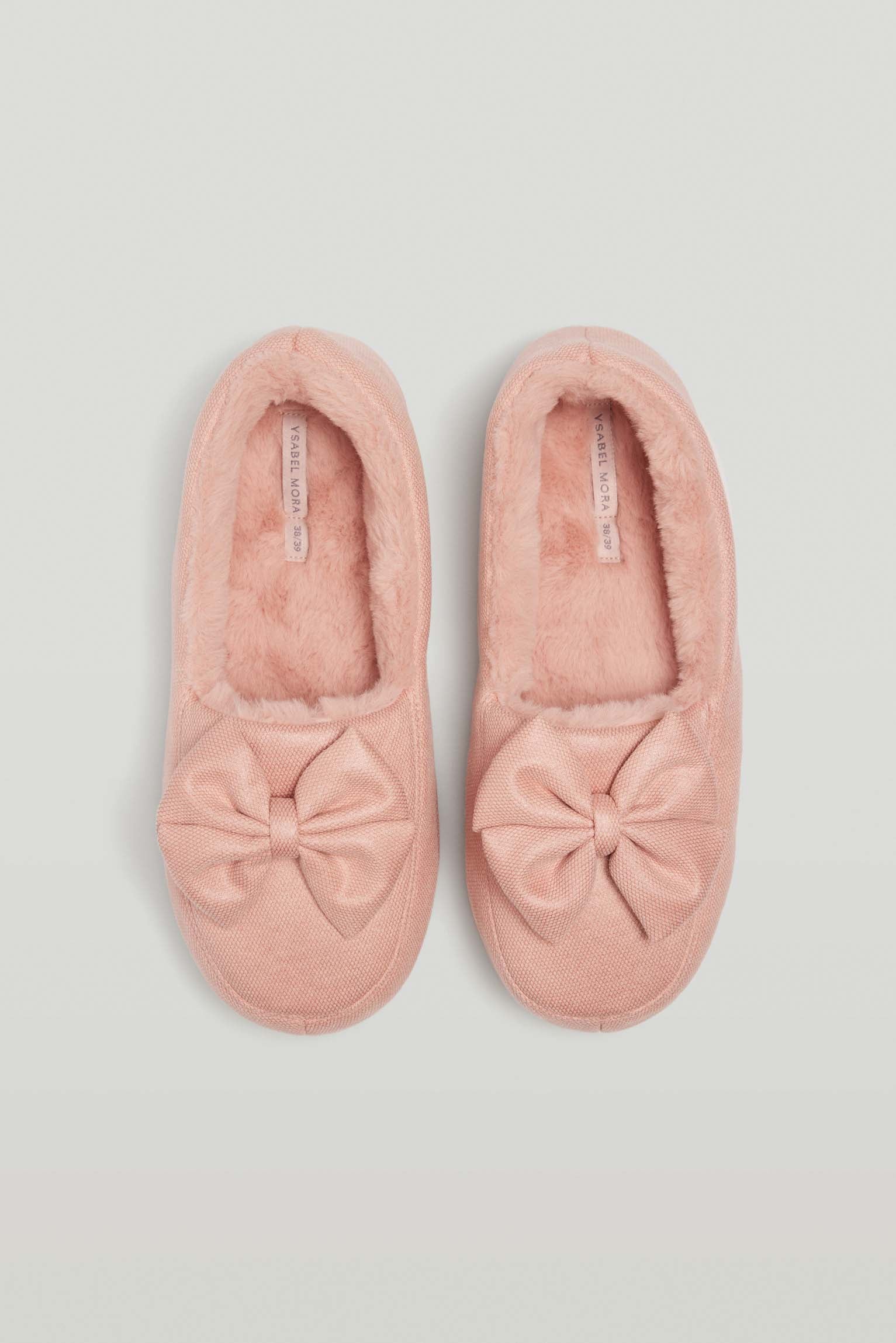 Chinelos de senhora, fechados com biqueira quadrada, estilo mocassim e com pormenor de laço. Pelo macio no interior e sola de borracha estampada com aroma a baunilha, o que as torna muito quentes e acolhedoras.